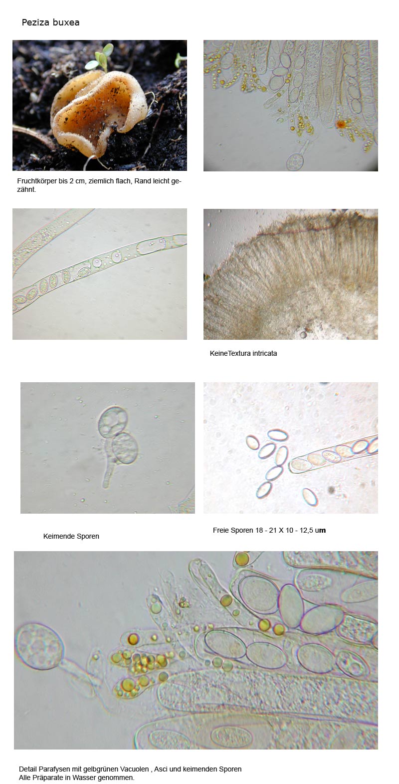 Wie versprochen die Peziza, da ich die Microaufnahmen für einigermassen gelungen halte.Die Peziza habe ich jetzt mit dem Schlüssel von Hohmeyer auf P. buxea festgenagelt. Ich fand keine textura intricata, das war wohl das entscheidende. Die gelbgrünen Vacuolen sind sehr auffallend bei den Exemplaren, die ich gefunden habe.