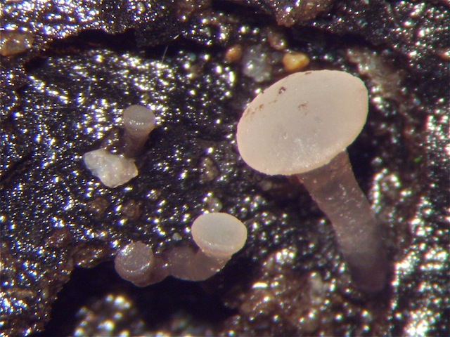 Da mein Hosenboden schon ziemlich feucht war, spielte es auch keine Rolle mehr, noch etwas mehr durchs Wasser zu strolchen. Ombrophila janthina/Fichtenzapfen-Gallertkreisling war auf sehr nassen Zapfen zu finden.