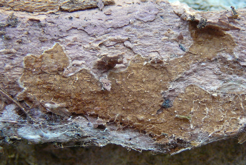 : Na gut, dann ist es ja verraten, also Hymenochaete carpatica (Bergahorn-Borstenscheibling).