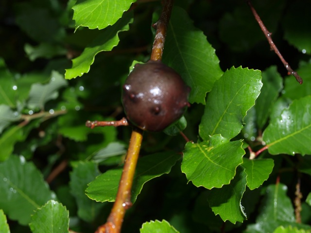 Wer kennt diese Pflanze? Tut mir leid, dass das Bild unscharf ist, lag bestimmt am Regen. Es handelt sich im einen stattlichen Baum, und die gezeigte Frucht, kugelig und mit einigen Stacheln/Warzen besetzt, misst etwa 3 cm im Durchmesser. Die Blätter sind vielleicht 6 cm lang.