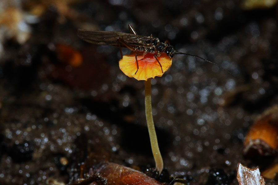 Weitaus kleiner, springt einem aber durch die Farbe nahezu entgegen, wenn man denn zufällig nahe genug am Boden ist, Mycena acicula:
