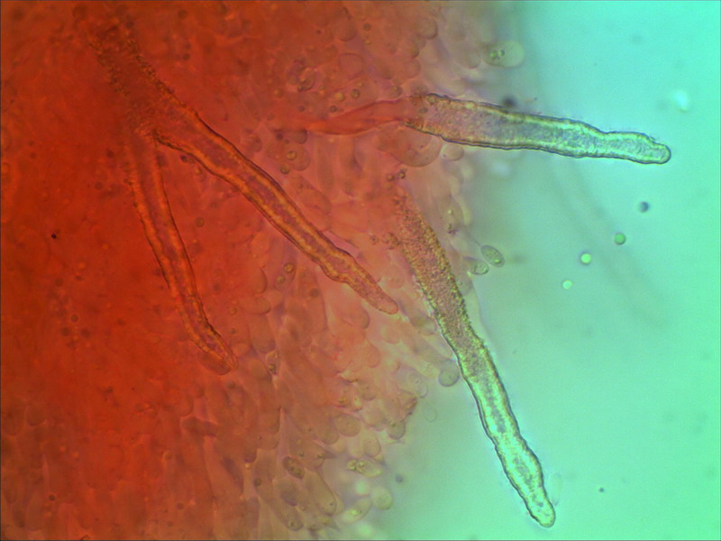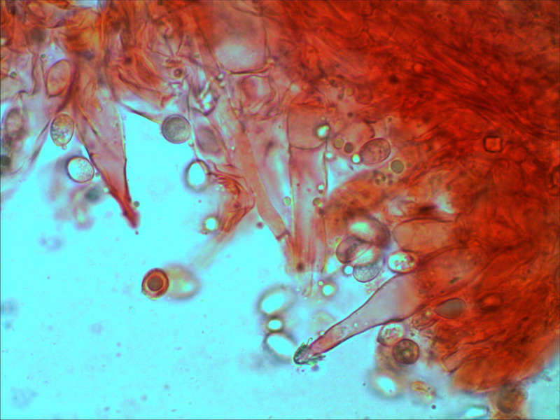 bei diesen Tintling bin ich mir garnicht so sicher, ob es sich um einen gewöhnlichen Grauen Faltentintling handelt, denn die Sporen waren im Mittel 7,5 x 4,3 ein Tuck zu klein (nach LUDWIG 7-10,5 x 4,5-6,5) Auch die ChZ waren bauchiger als dort gezeichnet. Ansonsten habe ich noch keinen Plan, welcher Tintling noch in Frage käme.
