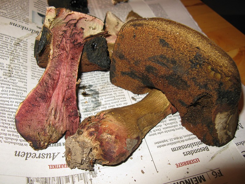 Hallo Roswitha, ich hatte vor zwei Jahren auch mal ein solches Exemplar, das statt zu blauen kräftig fleischrot angelaufen ist. Ich war völlig verblüfft und überzeugt, einen absoluten Exoten vor mir zu haben - dass Hexenröhlinge das im Alter mal tun dürfen, war mir unbekannt. Aber hier im Forum wurde mir schnell der Zahn gezogen, eine mykologische Sensation entdeckt zu haben, und ich habe den ollen Schlappen dann etwas enttäuscht, aber um eine Erfahrung reicher unter "Netzstieliger Hexenröhrling" abgelegt. Ich hänge dir mal ein Bild des Kandidaten an. Herzliche Grüße