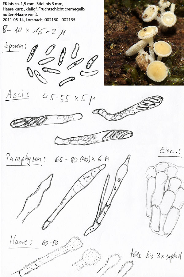 FK bis ca. 1,5 mm, vielleicht auch 2 mm, Stiel etwa doppelt so lang, gedrängt bis rasig wachsend, Außenseite und Haare hell (weiß), Fruchtschicht weiß über creme bis gelb, nicht rötend oder auf Verletzung reagierend, meine ich. Die Haare sind sehr kurz und erscheinen mehr kleiig.