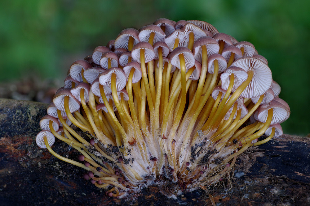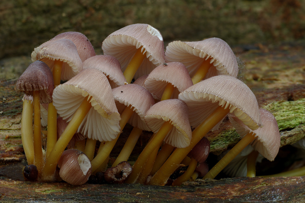 An Buchentotholz dann endlich mal was "saftiges" - frische gelbstielige Nitrathelmlinge - Mycena renati, wie ein Blumenstrauss: