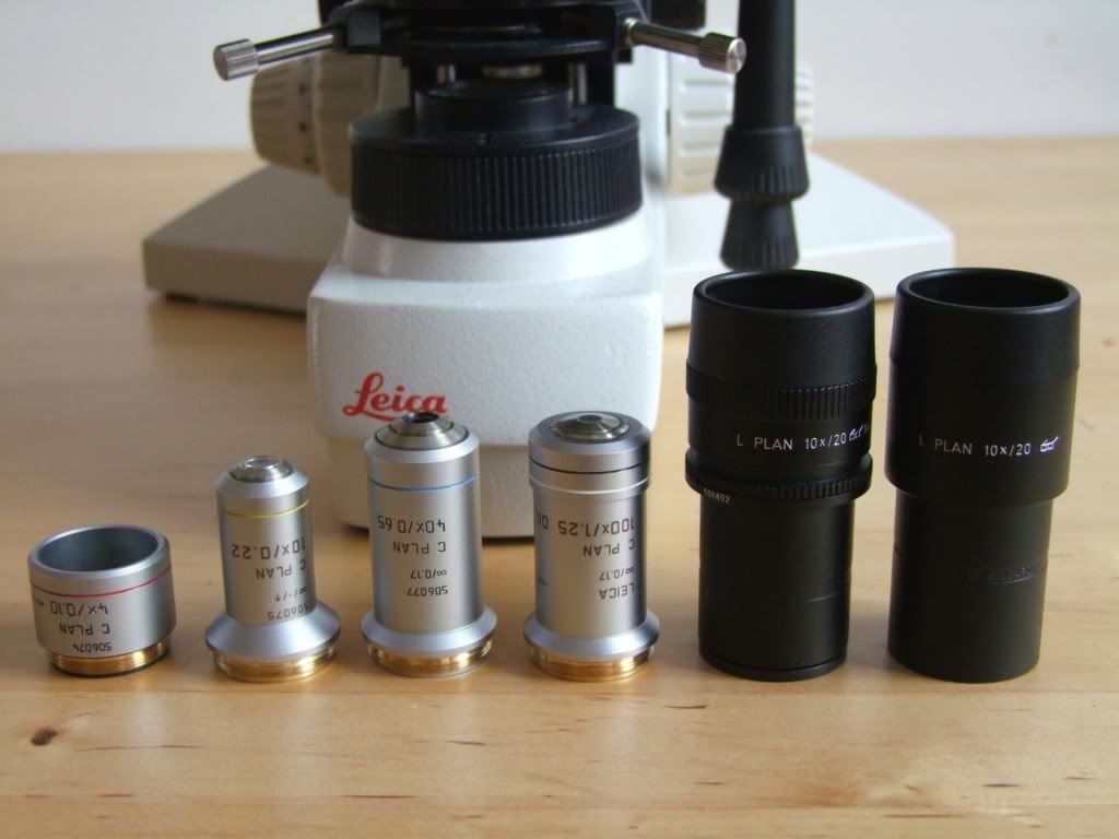 TUBUS: Leica 501 056 Trinotubus, 55-75 mm Augenabstand, 360° Drehung OKULARE: 1 x Leica 506 802 L Plan 10x / 20 Brille M (fokussierbar), 1 x Leica 506 809 L Plan 10x / 20 Brille, 2 x passende Augenmuscheln aus Gummi OBJEKTIVE: C-Plan, Gewinde M25: