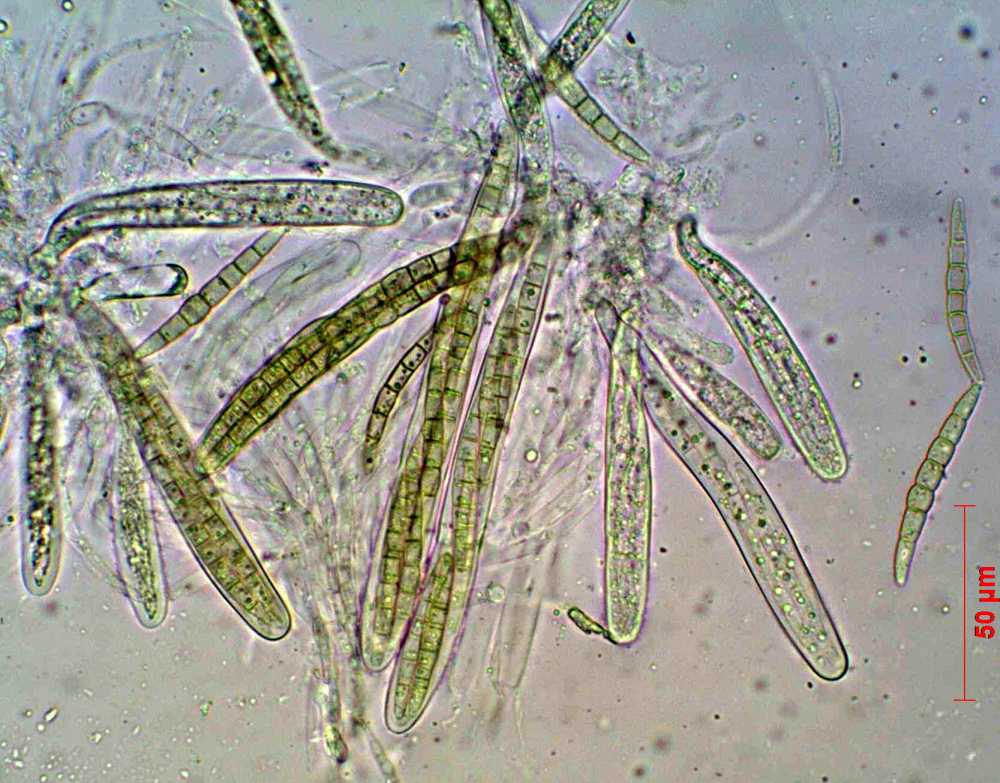 Hier wieder eine hilflose Anfängerfrage an die Pyrenofreunde. Auf vorjährigen Stängeln von Lupinus habe ich etwas gefunden, was eine Leptosphaeria (oder verwandte Gattung) sein dürfte. Die Kullerchen waren klein und flach. Asci zylindrisch, bei 78-120 x 11,5-14 μm, Sporen spindelig, etwas sichelförmig gebogen, 6-fach (selten 7-fach) septiert, an den Septen eingeschnürt, dritte (bzw. selten vierte) Zelle verbreitert, 49-60 x 5-6 (7) μm.