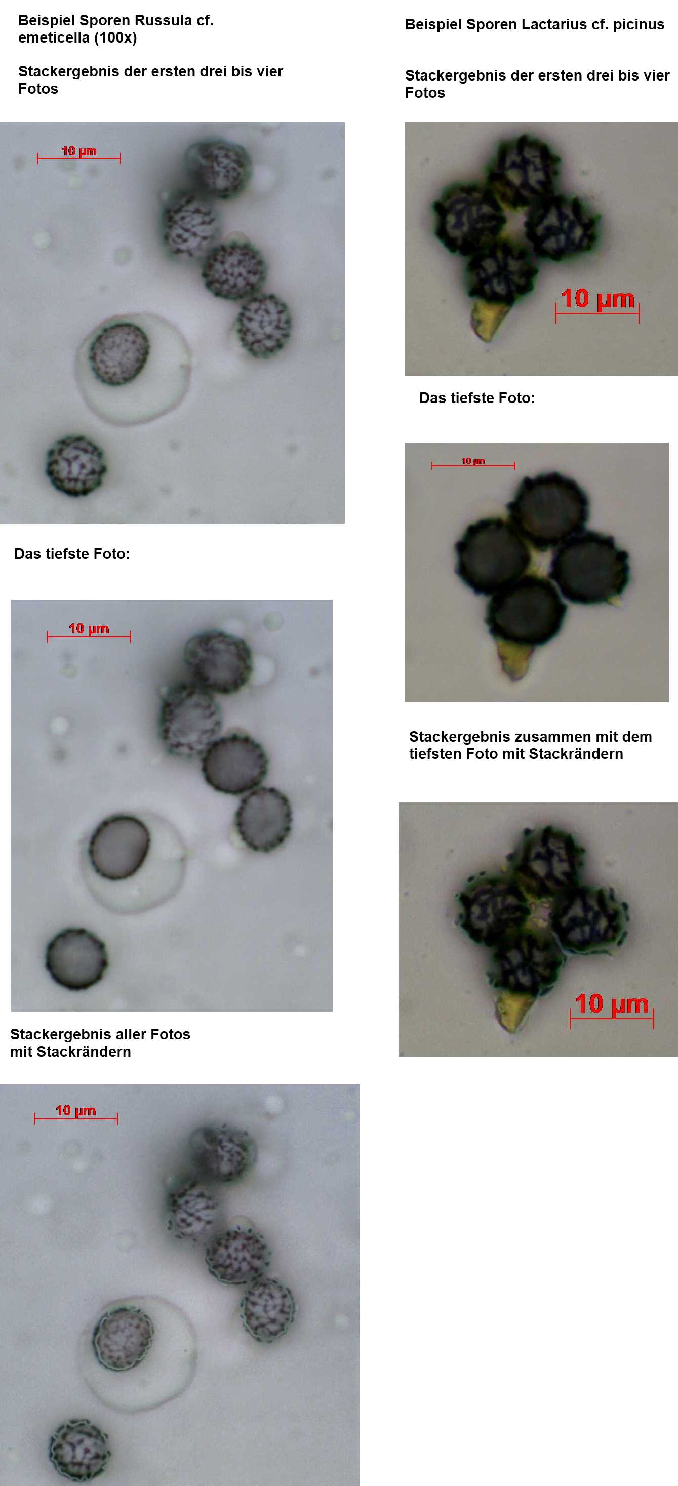 Hallo Ursula, ohne auch nur im Traum daran zu denken, es irgendwie in die Nähe der Qualität Deiner Dokumentationen zu schaffen, will ich hier dennoch mein „Problem“ (es gibt schlimmere!) erläutern. Ich lege ein paar Bilder von Russula- und Lactarius-Sporen bei, die das Ganze illustrieren sollen. Die weißlichen „Ränder“ (jeweils im letzten Bild der Serie gut zu sehen) treten – glaube ich – in jedem Falle auf, wenn man über den optischen Schnitt hinausgeht. Ich bekomme sie aber auch dann nicht vermieden, wenn ich nur in die Nähe des OS gehe. Bei Russula geht es meistens noch, aber besonders kritisch sind stark gratige Lactarius-Sporen. Hier kann ich oft nur einen kleinen Teil der Sporentiefe abbilden, ohne Stackränder zu erzeugen. Die gezeigte Spore ist mit ihren höchsten Graten um 1 μm an sich noch moderat, auch wenn der OS hier Schwierigkeiten bereitet, da aufgrund der Retikulierung immer Grate quer zur Bildebene verlaufen.