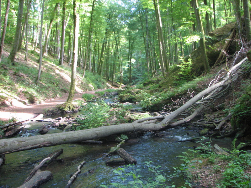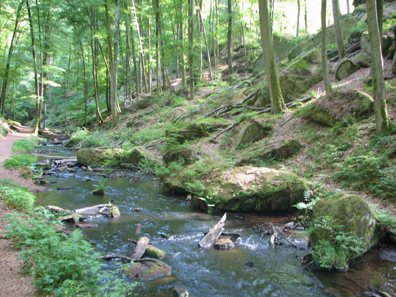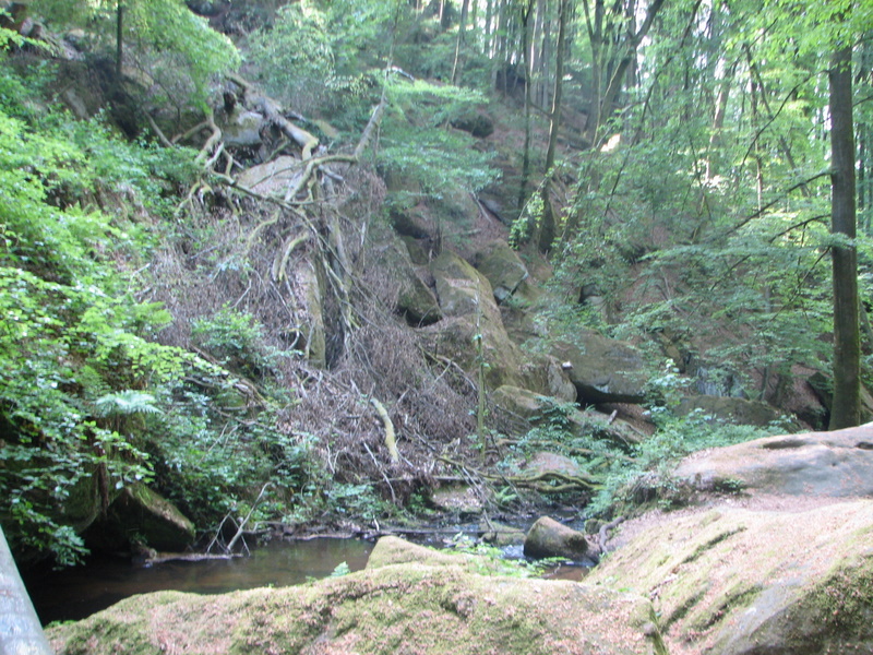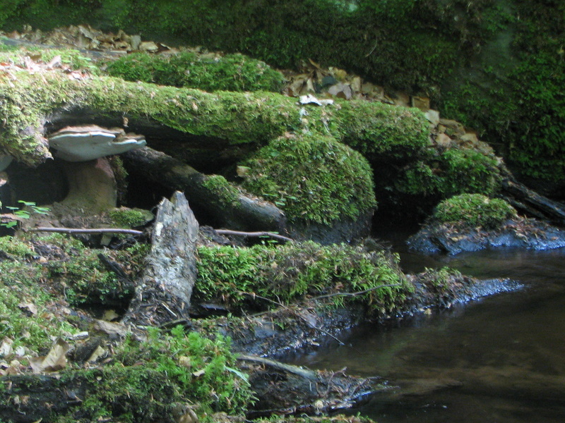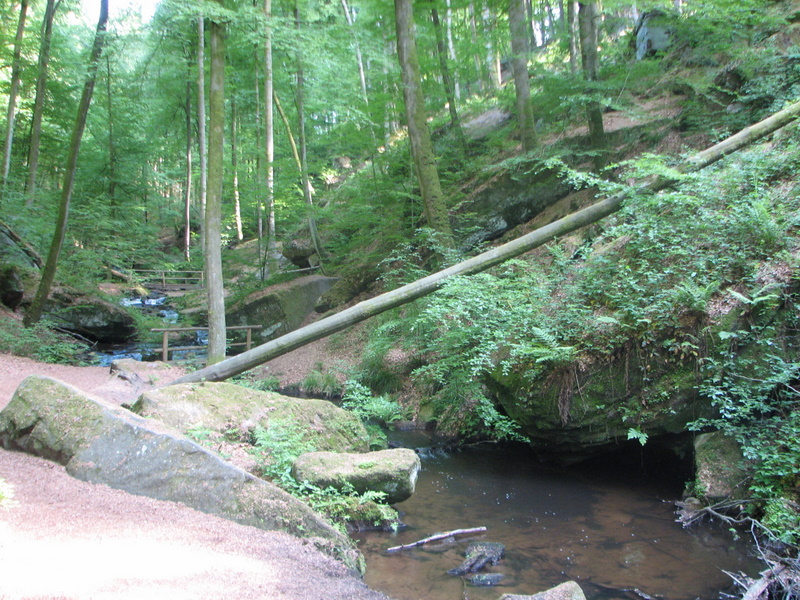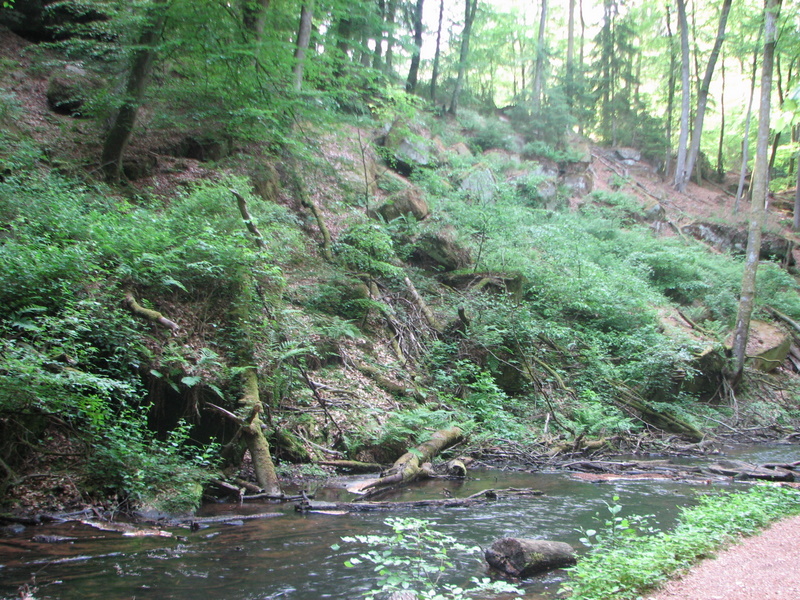 Bei einem Gespräch in der Gaststätte habe ich erfahren, das mit den 3 kurzen Regengüsse am Sonntag gerade der Staub von den Blättern entfernt wurde. An Pilzen haben wir neben vielen Konsolenpilze lediglich 2 Maiporlinge und einen Lamellenpilz an Holz gesichtet. Die Fotos zu letzteren sind leider durch zu starkes beizoomen bei wenig Licht unscharf geworden (was ich erst zu Hause feststellte). An Stellen wo fast keine Sonne hinkommt, war der Boden etwas feucht. Ein Fehlen von Pilzen führe ich darauf zurück, das es in der Schlucht doch kühler und auch noch jahreszeitlich zu früh sein wird. „Kleinkram“ war bei gelegentlichem Stöckchen drehen in Wassernähe auch nicht zu sehen. Trotzdem war es für ein schöner Ausflug. Am Sonntag, hoffentlich nach einem angekündigten und dringend notwendigen Regen, nehme ich einen neuen Anlauf in einem anderen Gebiet um endlich was vor die Linse zu bekommen. Für die Pfanne ist es noch etwas zu früh. Sollte jemand in nächster Zeit einen Pfalz-Aufenthalt planen, so kann ich einen Besuch dieses Tales wegen seiner Ursprünglichkeit nur empfehlen. Gruß aus dem Pfälzerwald