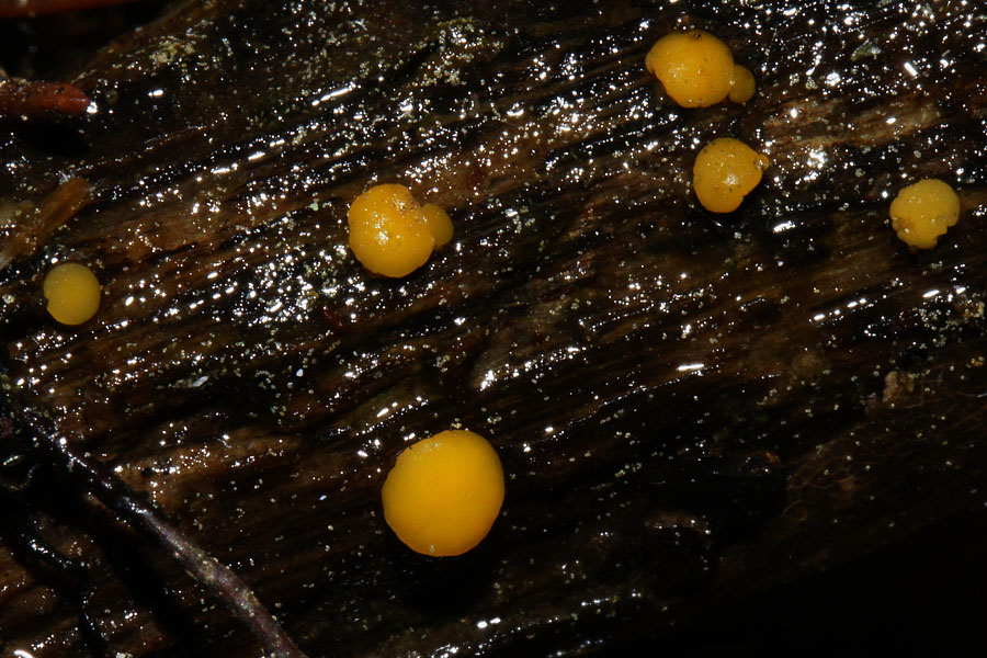 Größte Apothecien 2 mm, dottergelb, kissenförmig, Rand wellig gelappt, mit dickem, kurzen Stiel.