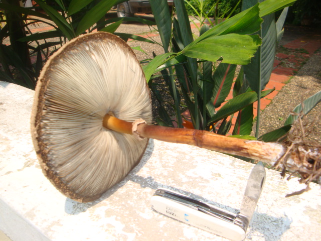 hallo pilzer. der pilz (waechst in suedamerika) sieht etwa wie ein parasol aus. hutdurchmesser 16 cm, hoehe 20 cm. stiel faserig bei bruch nicht roetend, lamellen rund einlaufend nicht am stiel angewachsen. hut hellbraun (beige) mit dunkelbraunen schueppchen , jung weiss. sporen junger pilz etwas gruenlich spaeter braeunlich.