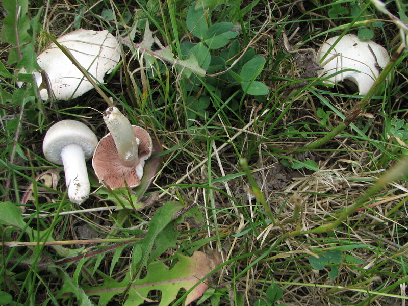 Wiesenchampignons (Agaricus campestris), die wir aber nicht mitnahmen. Ein Straße und die gespritzten Weinberge waren in unmittelbarer Umgebung.