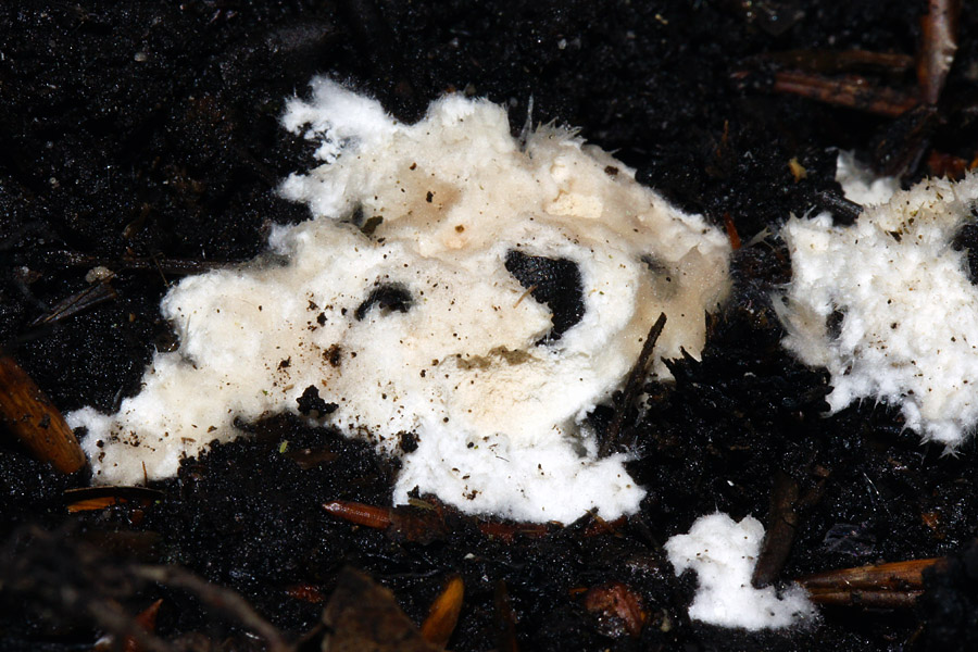 6. Diese wollig-pelzigen, etwa 1-4 cm breiten und ca. 5 mm dicken Überzüge auf frischer Erde/Pflanzenresten in einem