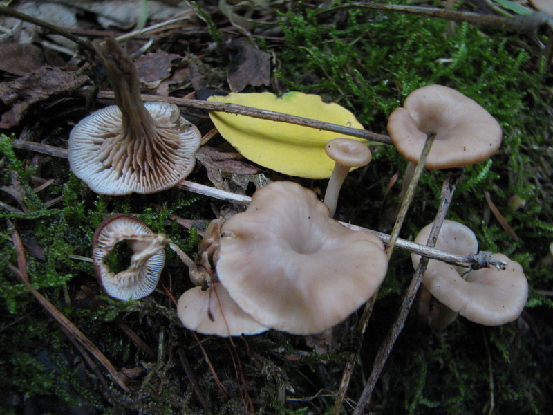 Bei diesen Trichterlingen, direkt auf einem vermoosten 10cm dickem Ast, tendiere ich sehr unsicher zu Fleischfalber Trichterling (Clitocybe diatreta).