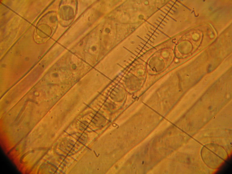 Hierzu noch ein Sporenbild. Die größten Sporen lagen bei etwa 18-19 x 9-10 mü. (1TS = 1,54 mü)