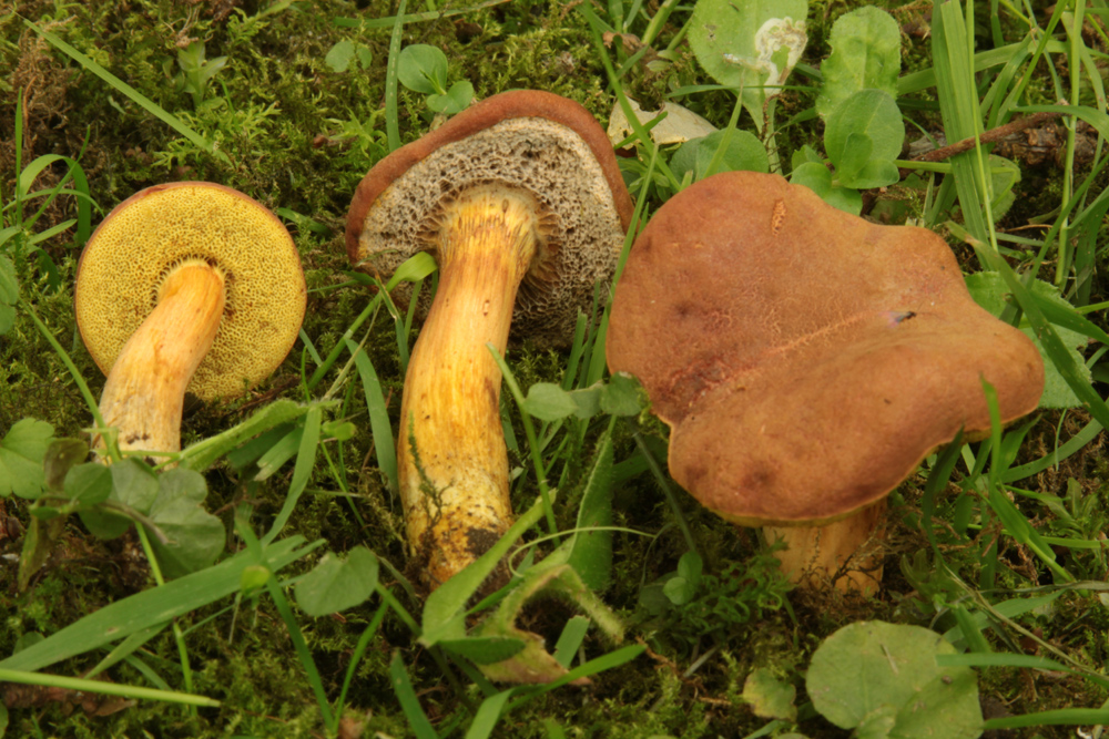 Diesen Pilz fanden wir gestern im Klever Forstgarten. Erst dachten wir an eine Ziegenlippe, die hat aber nicht so einen dunkelbraunen Hut. Deshalb könnte es nach M.Bon der Braune Filzröhrling sein (Xerocomus spadiceus). Das mittlere Exemplar ist an den Röhren wohl schon mit Goldschimmel befallen und nicht mehr für Speisezwecke geeignet.