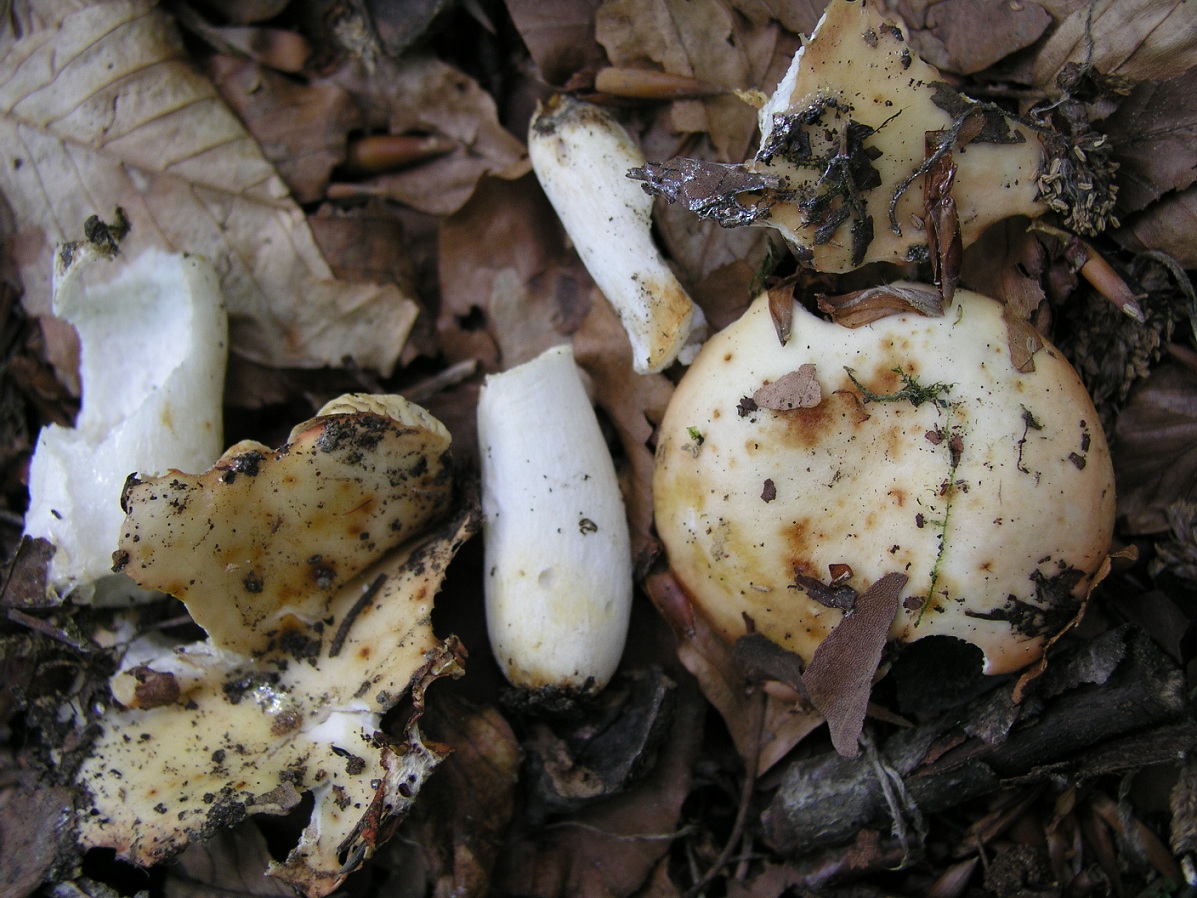 Standort war ein Waldrand mit Buchen und Fichte. Hut stark ausgeblasst und klein (bis 6 cm) Huthaut klebrig - leicht schmierig. Geschmack zuerst mild und nach 15 sek ziemlich scharf. Der Stiel zeigte ein eindeutiges Bräunen/Gilben am Stiel. Die Lamellen waren recht dottergelb, Sporen wollte er leider keine abwerfen.