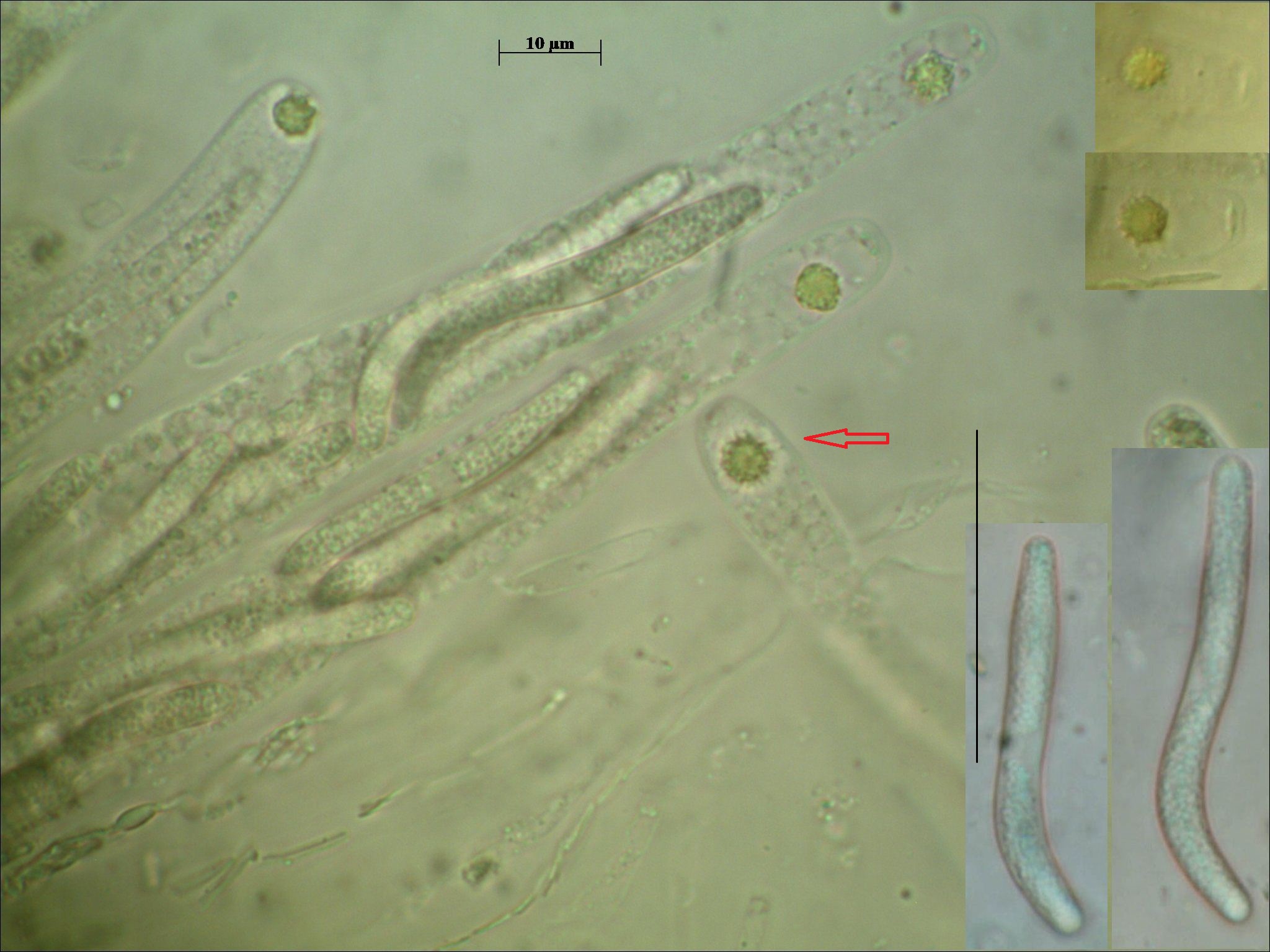 Bei der „Routinekontrolle“ von Lasiosphaeria ovina stolperte ich gestern im Schlüssel von Candoussau & al. (2001) über Lasiosphaeria chrysentera, die sich v.a. durch einen goldbraunen, stacheligen subapikalen Globulus (eine Kugel im unteren Bereich der Ascus-Spitze) unterscheiden soll, während er bei L. ovina hyalin und warzig sein soll. Nun waren meine Globuli deutlich stachelig (s. Foto, 100x, in Wasser). Miller & Huhndorf (2004) halten L. chrysentera jedoch für ein Synonym, u.a. weil sie bei der Typuskollektion keinen stacheligen subapikalen Globulus vorgefunden haben. Sie argumentieren, dass das Ornament durch den schlechten Erhaltungszustand bzw. die mangelhafte Konservierung der Kollektionen zustande komme. Meine Schäfchen waren nun aber absolut frisch. Wer weiß mehr dazu? Viele Grüße.