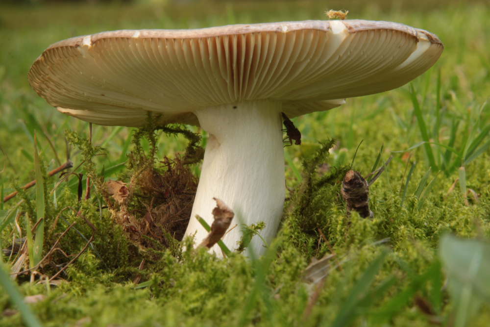 Hier die Unterseite des Täublings (Russula medullata?). Beachte auch die Pilzfliege am Stiel oben rechts - vermutlich ist sie bei der Eiablage. Der Pilz stand auf einem Rasen bei Buche und Eiche, saurer Boden.