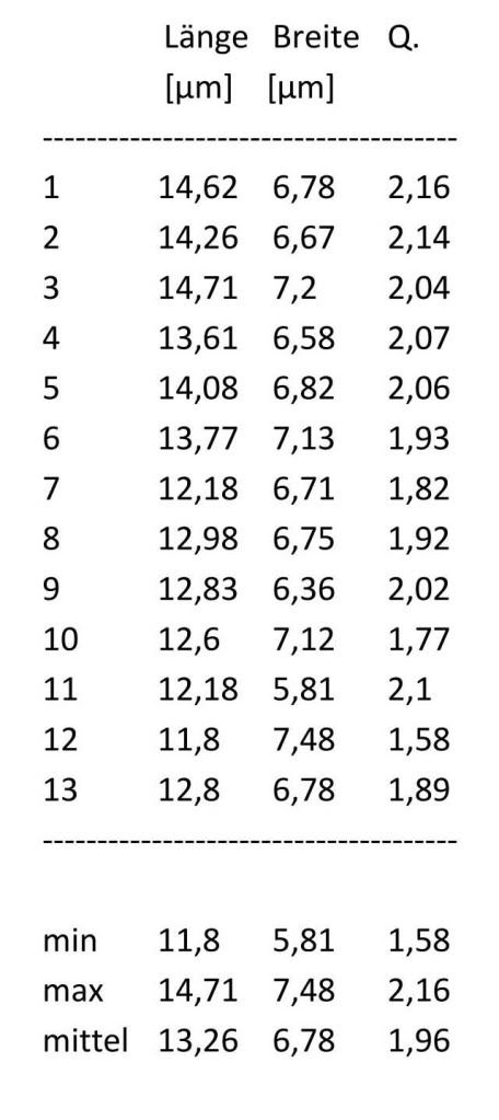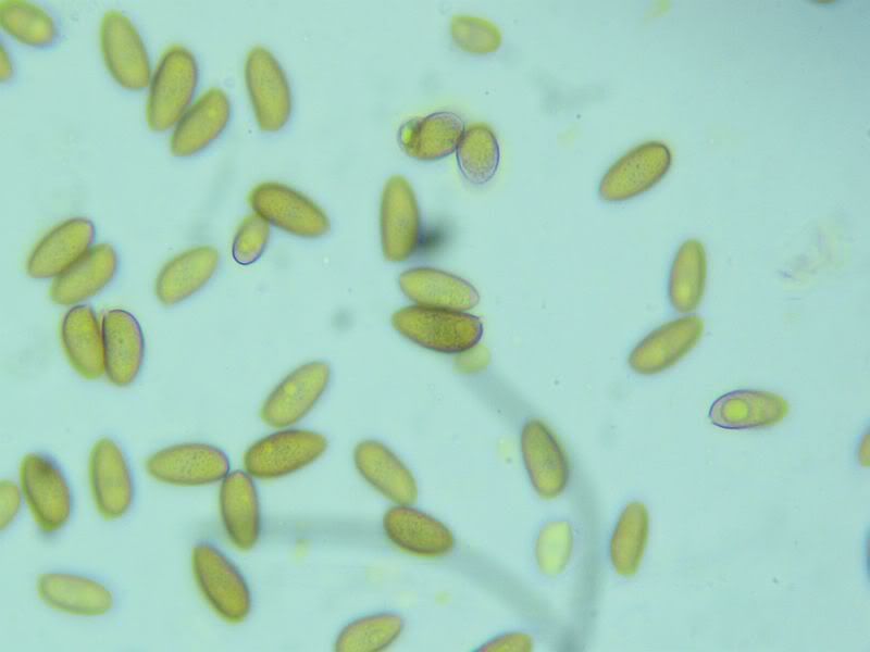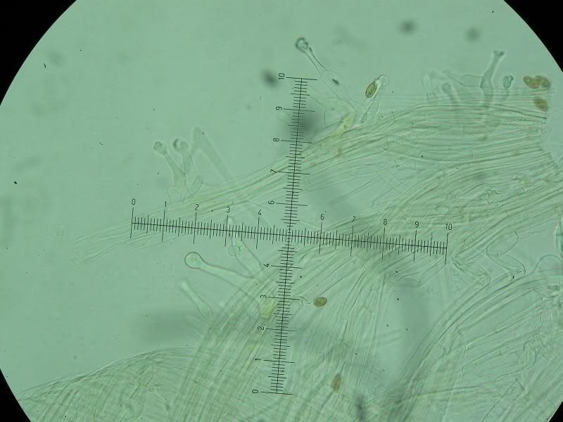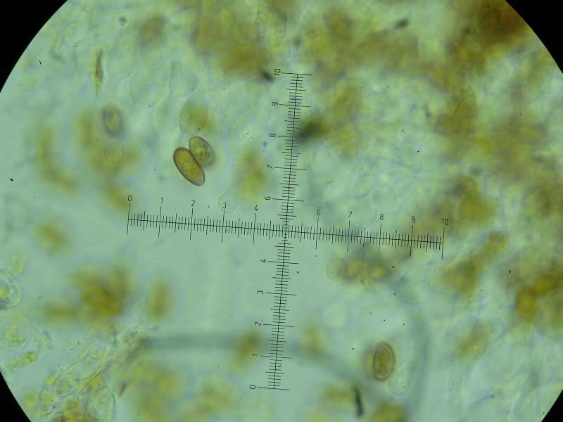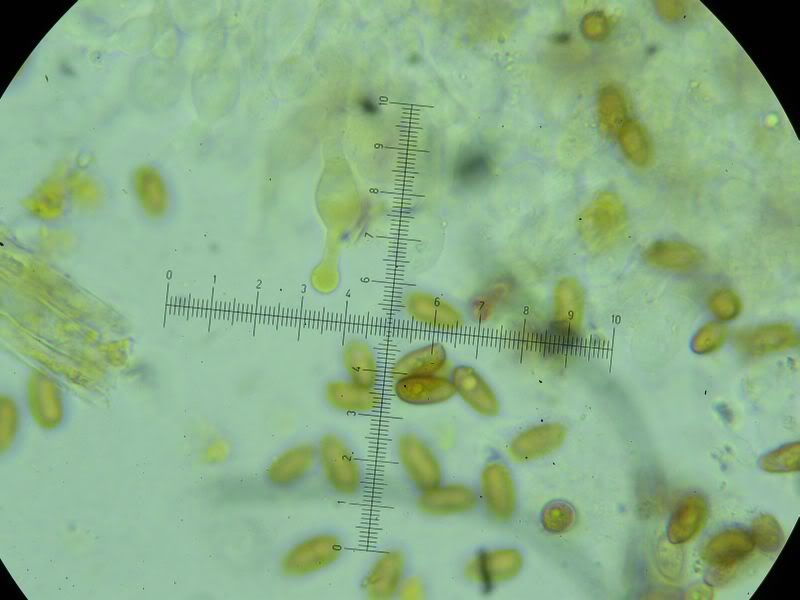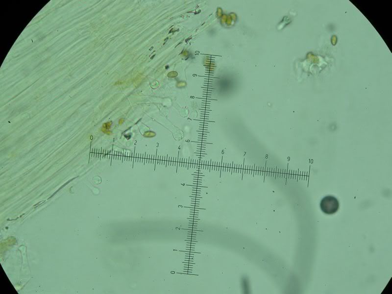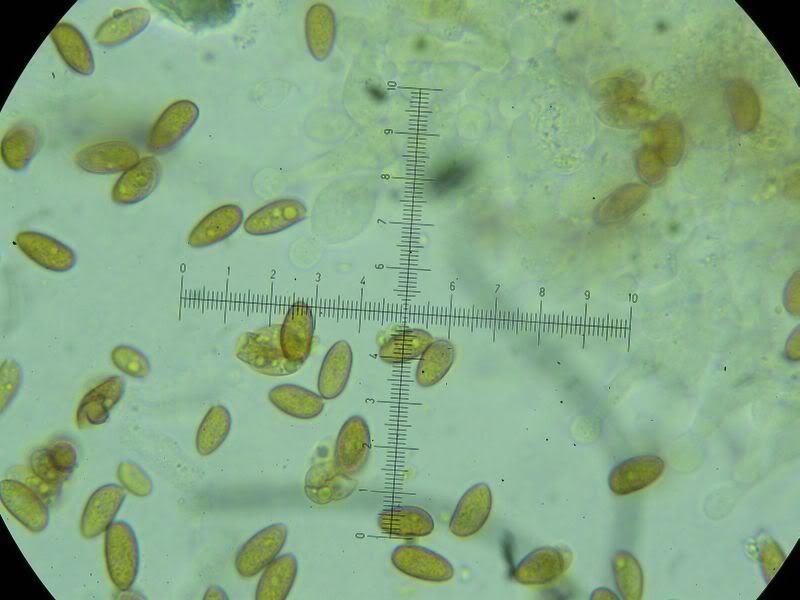 Das passt gar nicht! Gemessen in KOH. Kurze Kontrolle gestern im frischen Präparat ähnliche Größen. Die Cheilozystiden passen von den Messwerten her: Kopf zwischen 6 und 7 µm, Bauch zwischen 9 und 13 µm. Allerdings beschreibt und zeichnet Ludwig die Cheilo- und auch Kaulozystiden mit kurzem Hals. Bei mir waren überwiegend "Langhälse" am Start! Nun die Fotos: Sporen im Schnitt 1000x KOH: