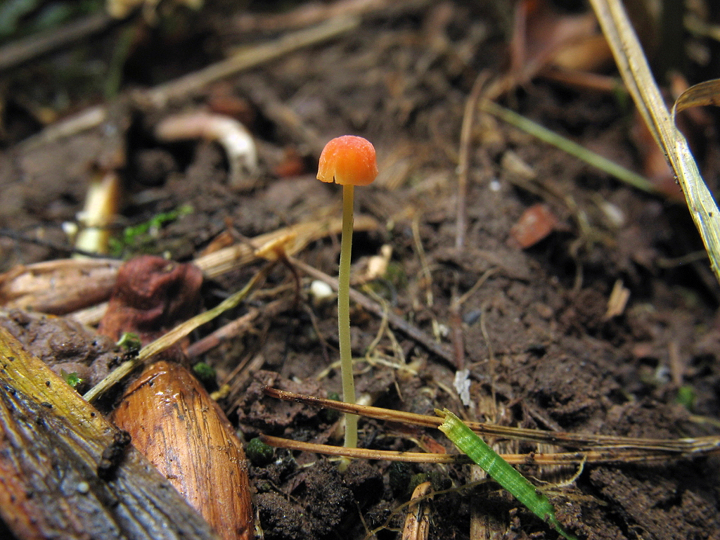 Der kleine Orange, der oben aus dem Hintergrund leuchtet ist Mycena acicula:
