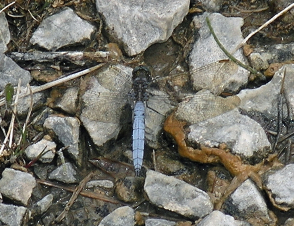 Und dort schoss Piwo aus der Hüfte (deswegen ist das Foto nicht so sensationell - das Vieh hat doch nicht still gehalten) eine Rarität: Kleiner Blaupfeil, Orthetrum coerulescens. Laut der Roten Liste der Libellen von Rheinland-Pfalz, ist sie mit 1, vom Aussterben bedroht, eingestuft.