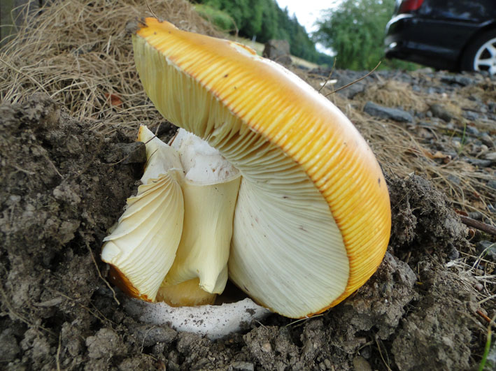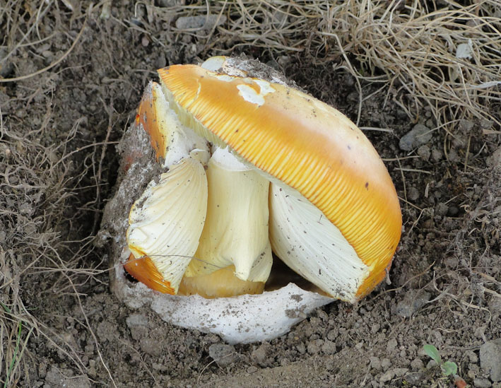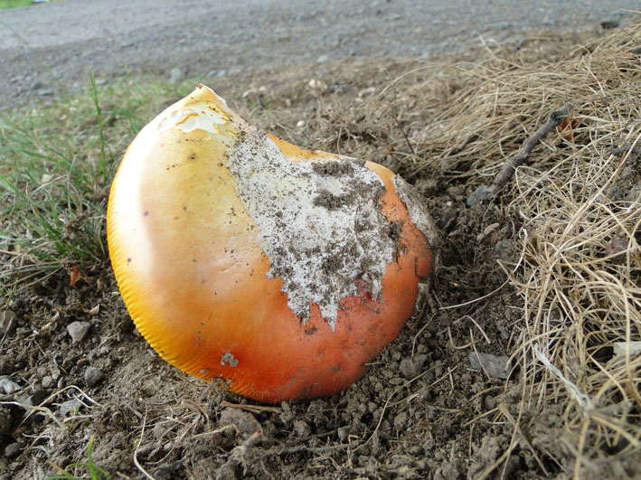 Auf dem Heimweg vom prima organisierten und interessanten Forumstreffen in der Pfalz (vielen Dank an Dieter, Joschi und alle anderen Helfer) sind wir noch an der Stelle vorbeigefahren, an der Matthias Fischer vor einigen Jahren die ersten Odenwälder Kaiserlinge entdeckt hatte. Trotz Wärme (vielleicht auch gerade deswegen) und nur geringen Niederschlags hatte sich dort ein Kaiserling mit Kraft durch die harte Erde gedrückt und dabei seinen Hut etwas zerstört.