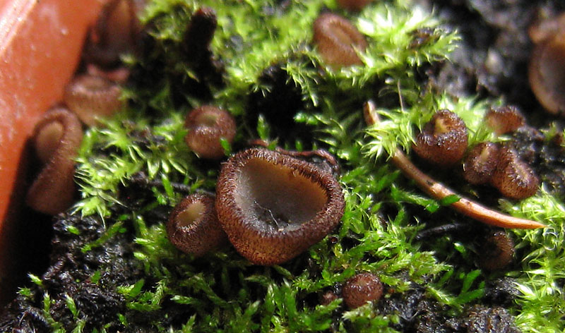 heute entdeckten wir in einem unserer Blumentöpfe auf dem Balkon eine Becherlingsinvasion.