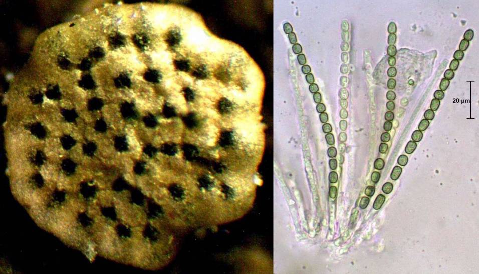 Ein neuer Fund, und wieder musste ich zur (m.E. zu Unrecht gescholtenen) Jaklitsch-Arbeit greifen. Diese als „widespread and common“ charakterisierte grünsporige Hypocrea wäre durch ihr Vorkommen auf Holz, die kleinen (bis ca. 2 mm großen), nicht tuberkulaten (d.h. nicht maulbeerförmigen) Stromata mit weißlichen bis gelblichen Grundfarben und die dimorphen Sporen festgelegt. Letzteres Merkmal lässt sich bereits mit einem 20x-Objektiv feststellen: Bei der Sporenteilung entstehen jeweils zwei ungleiche geteilte Ascosporen (eine rundliche und eine längliche), sodass man im Ascus im Idealfall kurz-lang-kurz-lang ... sieht. Hypocrea strictipilosa, gefunden an Esche
