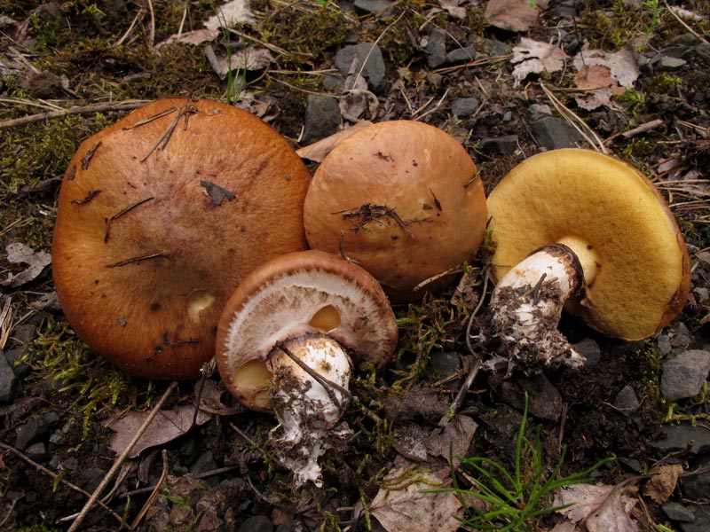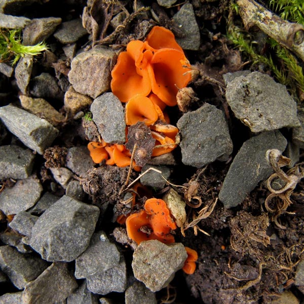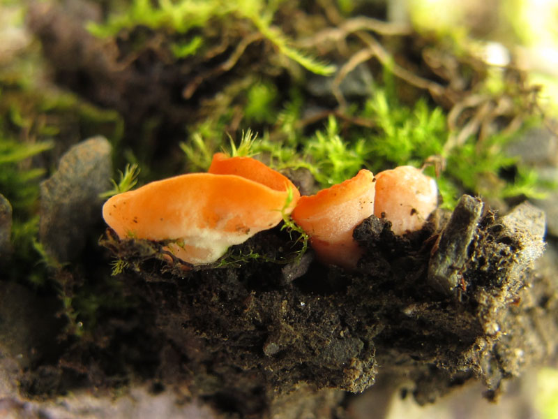 mal mit Ring Suillus luteus. Die standen wirklich überall unter den Kiefern, auch direkt im Schotter. Schön bunt gemischt und von oben seltenst zu unterscheiden. Selbst der Ring und die Velumreste waren nicht immer sofort an den S. luteus zu erkennen. Der weiße oder rosa Basisfilz/-mycel brachte aber Klarheit. Abgerundet wurden die Ansammlungen durch irgendwelche (sorry) Täublinge und Risspilze. Zweimal begegneten mir dann aber auch diese kleinen (max. 5mm) Becherlinge im Splitbett.