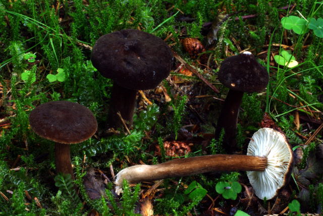 von der Beschreibung her käme auch Lactarius lignyotus ("Mohrenkopf") in Frage oder L. picinus (Pechschwarzer Milchling) oder L. romagnesii. Weiße Lamellen hat aber nur ersterer.