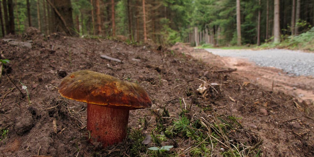 Ein Flockenstieliger Hexenröhrling Boletus erythropus trotzt dem Wegebau. Etwas später und einige Pfifferlinge weiter dann die zwei hier.