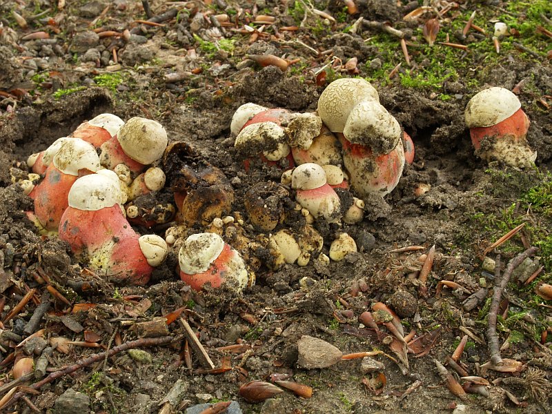 Unglaubliche 50 Fruchtkörper des Satansröhrling auf einem Haufen.