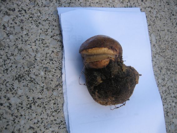 Bild 2 Brötchenpilz (alle Fruchtkörper weisen nach einiger Zeit diese Kerbe auf, keiner der Fk ist nach Aussage des Ratsuchenden anfangs reinweiß)