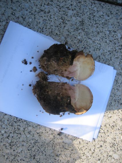 im Schnitt gut zu sehen: die blass-weinrötliche Verfärbung des unteren Innenlebens (in natura etwas kräftiger gefärbt)