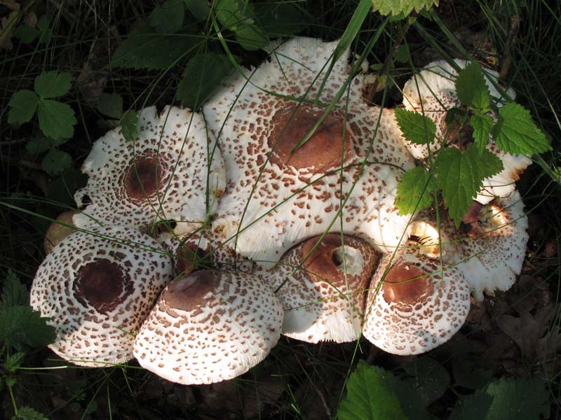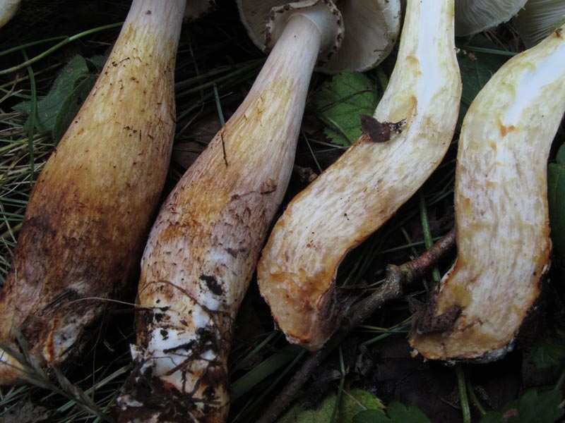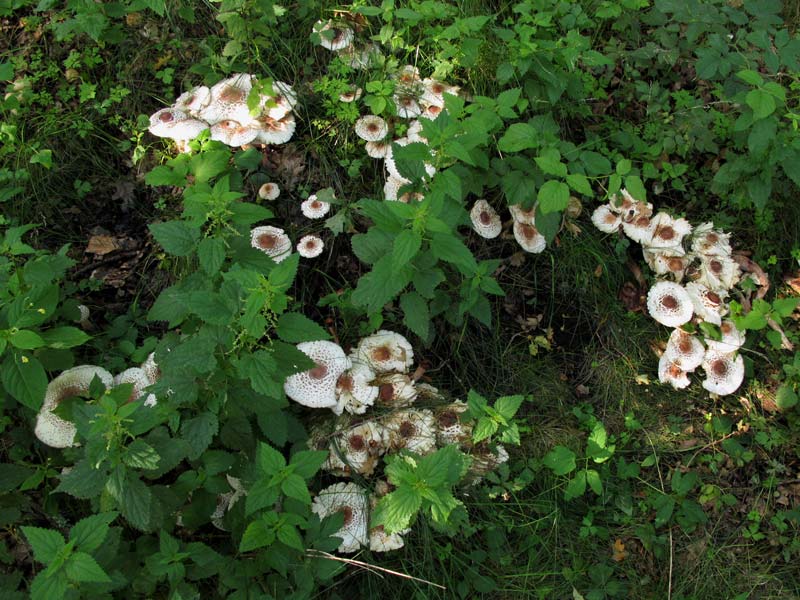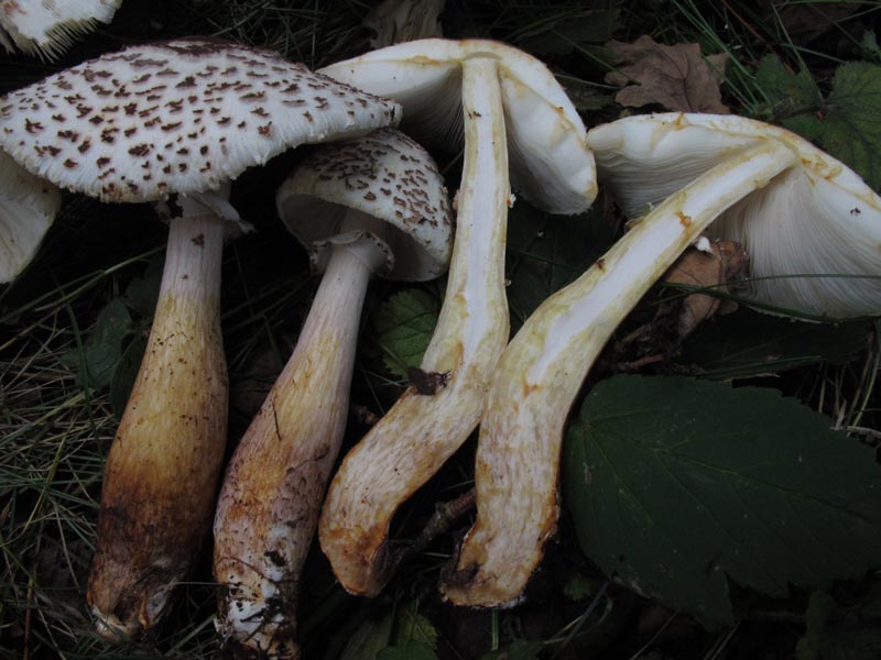Kleine Beschreibung: Standort Straßenrand / Parkplatz zwischen zwei alten Eichen, ich meine mich zu Erinnern, daß dort letztes Jahr "illegal" Laubstreu abgeladen wurde; Hut 8-25cm, rotbraune Kappe und Schuppen auf weißem Untergrund, getrocknet besonders am Hutrand hell-weinrötlich verfärbend, Stiel 10-20x1-4cm, bauchig oder mindestens deutlich spindelig, ohne Knolle, an der Basis ausspitzend, obere 2/3 hohl, längsfaserig, weiß, bei Berührung sofort Chromgelb anlaufend, nach einigen Sekunden in Safrangelb-orange umschlagend und nach wenigen Minuten dann Weinrötlich-rotbraun, Ring dünn, aufsteigend mit zahnradartigem rotbraunem Rand; Fleisch weiß, wie Stiel verfärbend, Geruch leicht stechend unangenehm; Sporenpulver weiß, in Lugol rotbraun verfärbend (dextrinoid); Chemie Salmiak auf Hut (Exikat) kurzzeitig grün verfärbend, KOH auf Hut (Exikat) braun; Nach einigem Herumirren in den Lepiotacae bin ich letztendlich beim Büschelligen Egerlingsschirmling Leucoagaricus americanus gelandet. Die Beschreibung in Pilze BaWü passt soweit ganz gut. Kennt jemand das angeblich sehr seltene Pilzchen und könnte dies soweit möglich bestätigen? Gruß Joschi