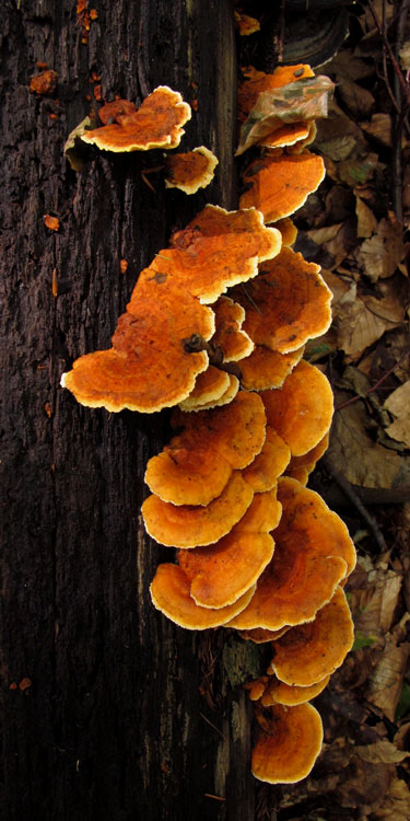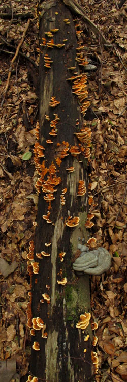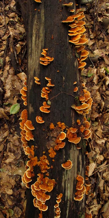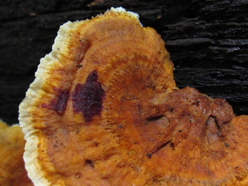 Hier noch mal der KOH Test vor Ort, schön Tintenrot. Bei dem Substrat und der Masse an FK muss man erst mal drauf kommen, daß es ein Leuchtender Weichporling Pycnoporellus fulgens ist. Der Rotbuchestamm war auf vier Metern Länge voll damit, selbst auf der Unterseite. Bei 50 FK auf nur einem Meter habe ich dann aufgehört zu zählen.