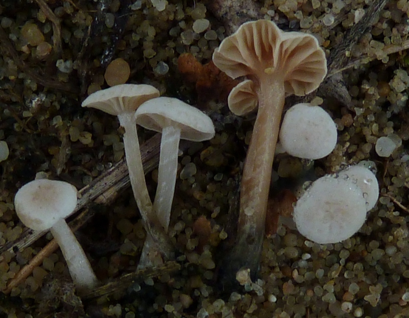 Ein winziger weisser Pilz (1-2cm hoch HDM unter 1cm, Stiel an der Basis graublau)