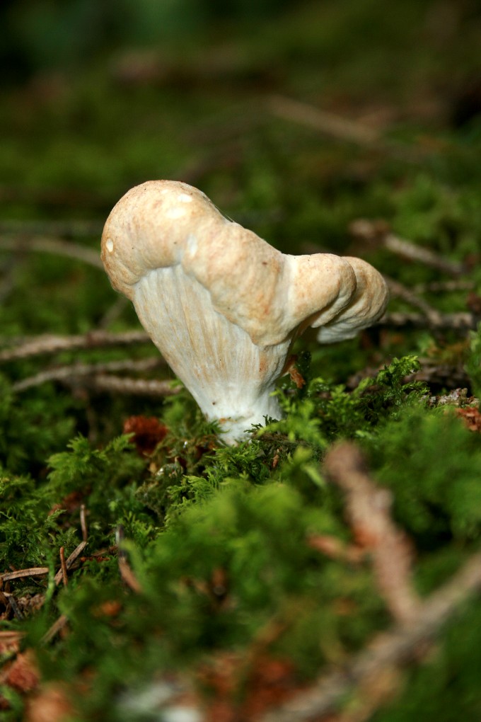 Am 13.08.11 habe ich einen merkwürdigen Pilz gefunden: Ich dachte zuerst an die abgestutzte Keule Clavariadelphus truncatus, habe mir im Internet etliche Fotos + Beschreibungen angesehen, aber irgendwie passt das alles nicht so richtig. Fundort: klassischer Maronenwald (alter, lichter Fichtenbestand mit Moosboden). Beschreibung --> siehe Fotos, Fleisch weißlich, mürbe, mild im Geschmack, NICHT süßlich. Erinnert an milden Semmelstoppelpilz, aber weniger schnittfest. Da er Leisten hat --> Pfifferlingartig? Aber er hat nicht dieses ausgeprägte, leicht scharfe Aroma des Pfifferlings. Die Pilze sind innen mit homogenem Gewebe von unten bis oben, wie eine z.B. Herkules-Keule oder Pfifferling. Farbe außen wie frischer Semmelstoppel, innen das Fleisch heller. Ich habe die 2 Exemplare, die ich fotografiert hatte, noch im Kühlschrank. Den Größeren habe ich längs halbiert und unten die Würmer weggeschnitten. Sie sind in guten Zustand, werden halt täglich kleiner, weil sie trocknen. Zu den Fotos: