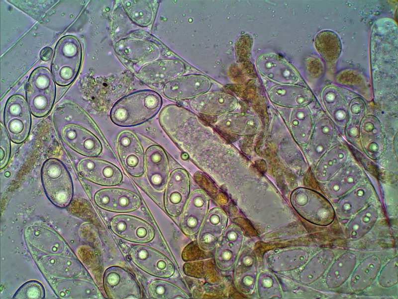 Liebe Pilzfreunde wieder ein Becherling, den ich noch nicht hatte. Auffällig die Sporen mit zwei kleinen Öltropfen, sehr feines isoliert punktiertes Ornament, Sporengröße 14,9-16,2-17,2 x 8,9-9,9-10,9. Paraphysen mit weinbraunen Inhalt, kopfig und teilweise gekrümmt. Weutere Fotos können gezeigt werden. Im Hohmeyer komme ich in die Nöhe von Peziza violacea, aber die Sporen sind wohl zu groß und von einer Brandstelle habe ich auch nichts gesehen. Welcher Becherling käme noch in Frage? LG Hartmut