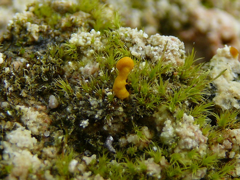 Dummerwiese gelangte ich doch (verbotenerweise) in den Gipstagebau und mußte die Kanten begutachten. Diese Minnikeule nahm ich mit, mitten auf Moos (welche Art?) und Gipsuntergrund. Ein Rostpilz oder ein Schleimpilz ?! Vielleicht kennt ihn ja einer:
