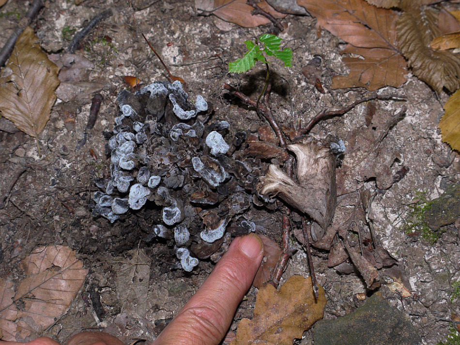 Hallo, gestern fand ich in einem Hainbuchen/Lindenwald im Gebiet nördlich des Donnersberges einen eigenartigen Pilz. Er sah als ob Totentrompeten ganz dicht aufeinander zurücken, so sehr, dass ein sich ganz fest anfühlender Knubbel entsteht.