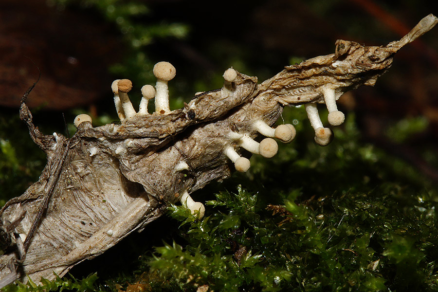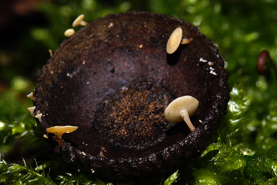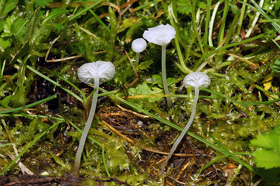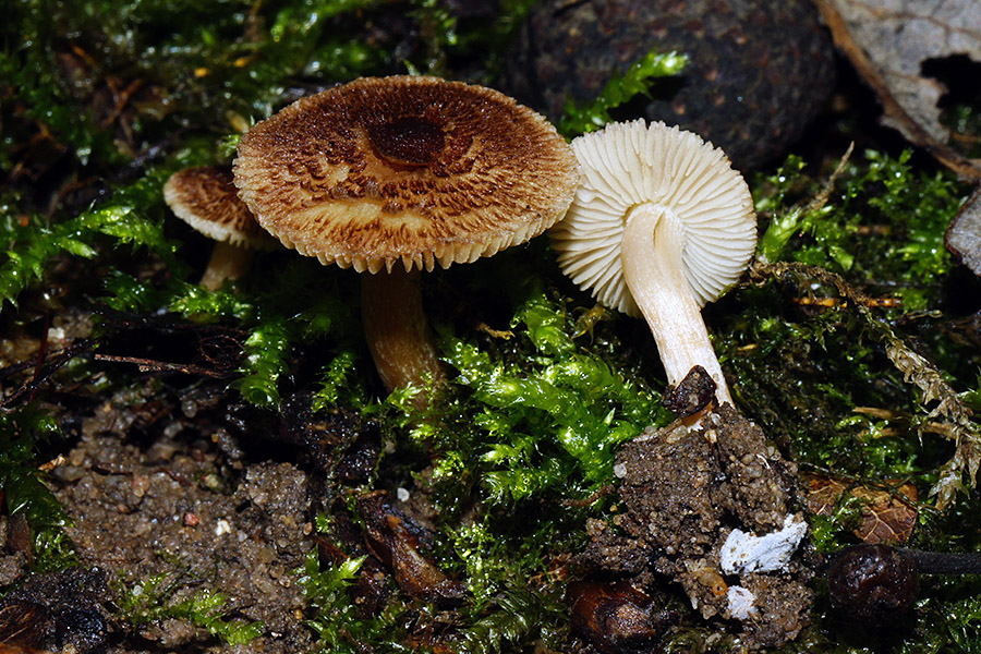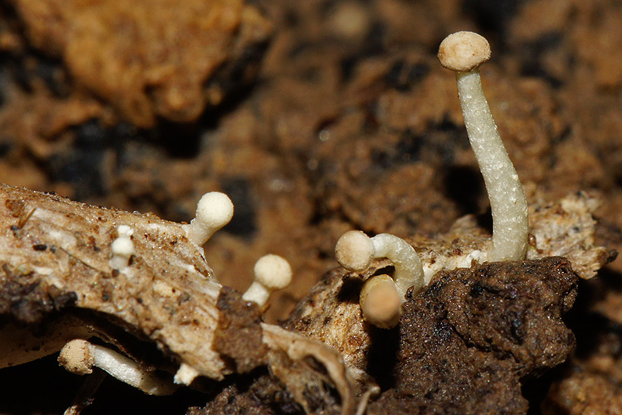 1. Am gemähten Wegrand zwischen Moos und Gras, wahrscheinlich auf Graswurzeln, Hut bis 5 mm,