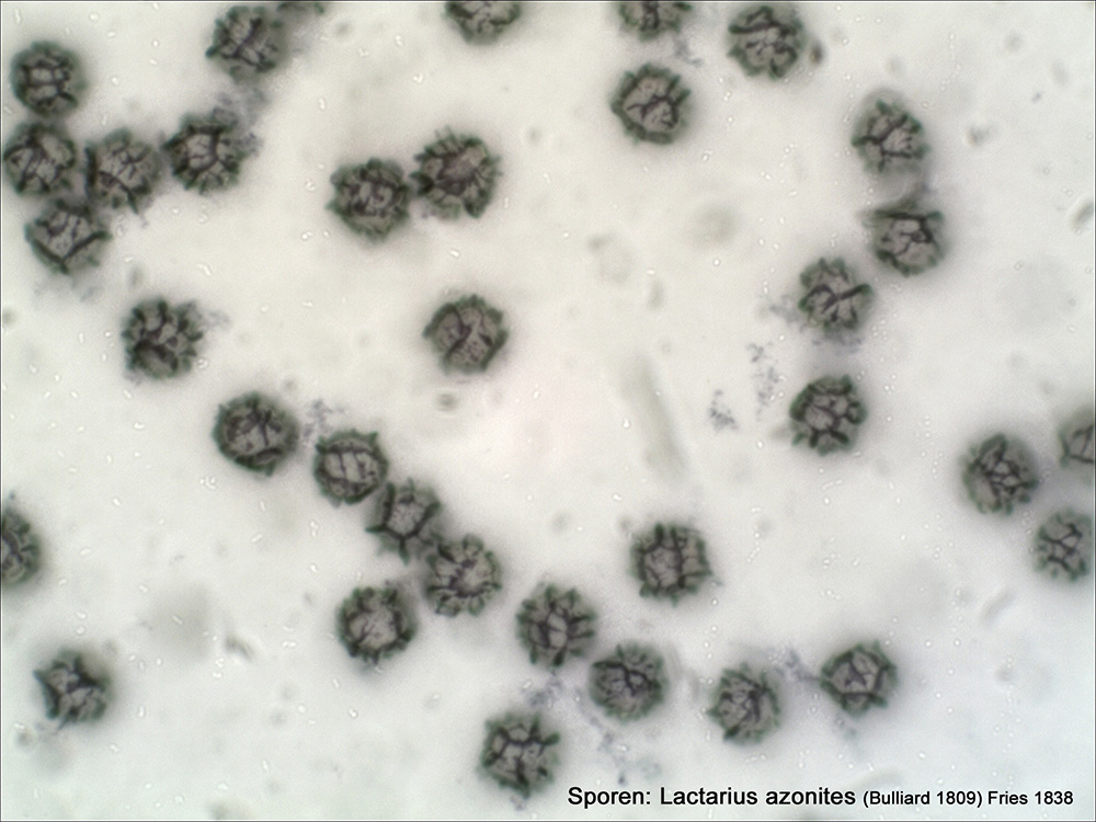 13) Rauchfarbener Milchling - Lactarius azonites (Sporenbild anbei) 14) Harter Zinnober-Täubling – Russula lepida 15) Grüner Anistrichterling - Clitocybe odora