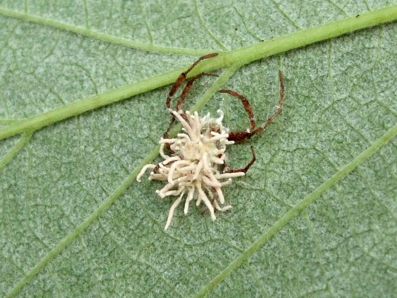 Hallo zusammen, vorgestern fand ich in der Umgebung von Burgdorf bei Hannover unter einem Himbeerblatt diesen parasitoiden Pilz (ca. 5mm Ø, Keule?) auf einer Spinne.