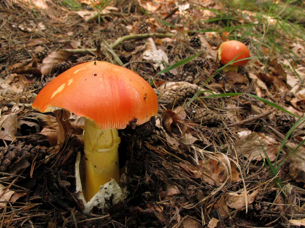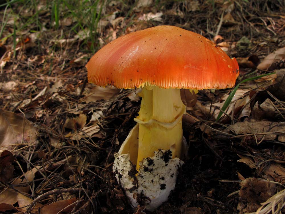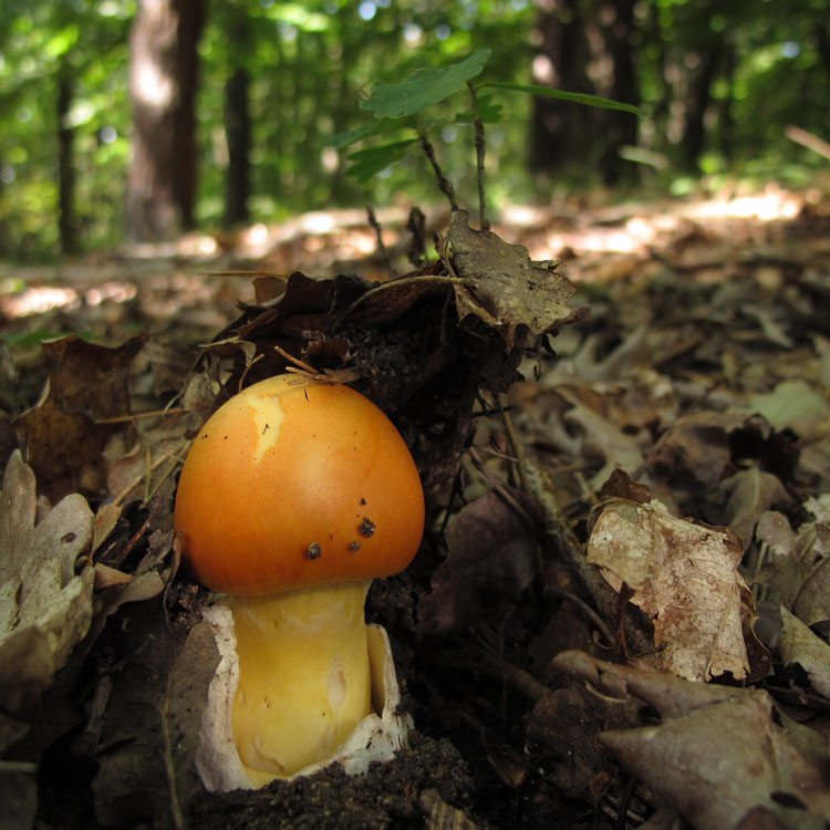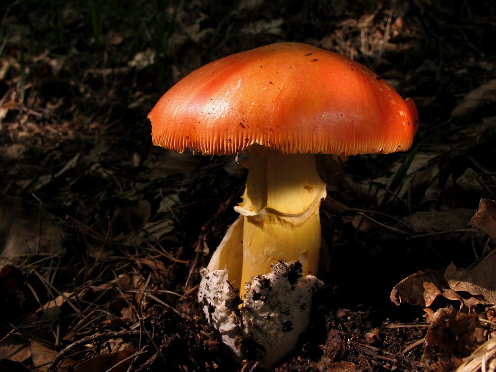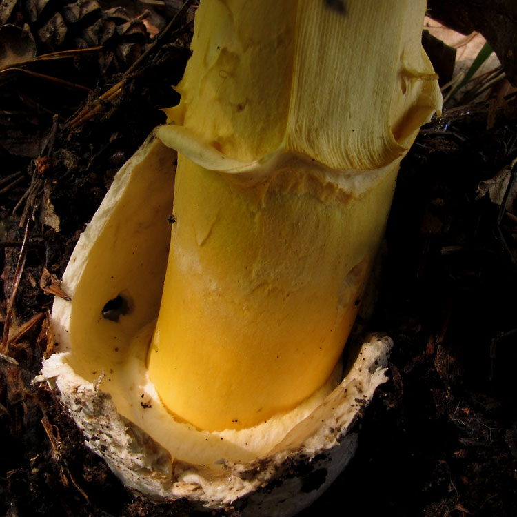 Hier noch ein Blick unter den Hut auf den Fuß. Fand es interessant wie der Stiel aus dem wattigen "Velum" herauskommt und nicht mit diesem fest verwachsen ist. Erinnert etwas an den beweglichen Ring bei Riesenschirmlingen.
