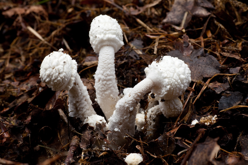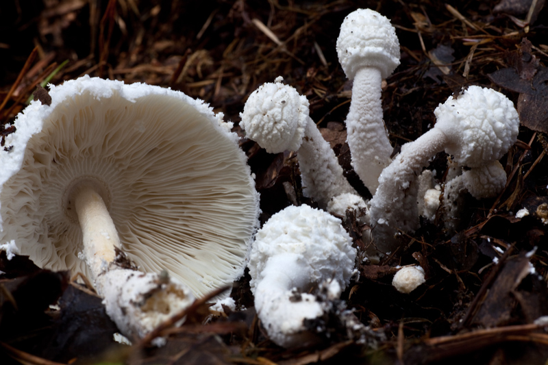 Liebe Pilzfreunde, in einem Fichten-/Kiefernwald wurde vor einiger Zeit am Wegrand eine Mist-/Kompost-Deponie angelegt, auf der ich die gezeigten Pilze fand. Hut und Stiel sind sehr flockig beschichtet; bei jeder Berührung bleibt etwas an den Fingern haften.