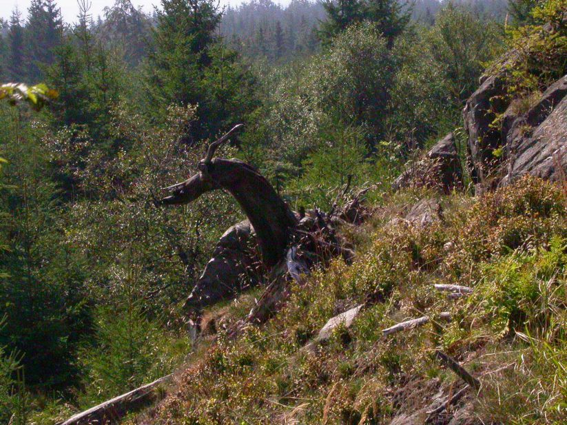 Strukturen in der Baumrinde von Fichten, allesamt bis in ca. Manneshöhe!