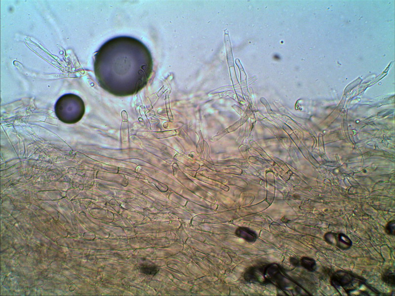 Hallo Karl die HDS besteht nicht aus kugeligen Zellen. Dermoloma cuneifolium zumindest kenne ich recht gut von unterschiedlichen Standorten. Diese Pilze sind zierlicher und dunkler. Die anfangs gezeigten Sporen sind in MELZER fotografiert, ich denke die Sporen sind inamyloid. Diese Sporen gehören auch zur Kollektion Bild 1 bis 2 (mit den dunkleren Stiel), hab ich eben noch mal im Quetschpräparat nachgeprüft. Sporenform dürfte auch nicht zu einer Dermoloma Art passen. LG Hartmut