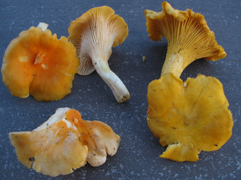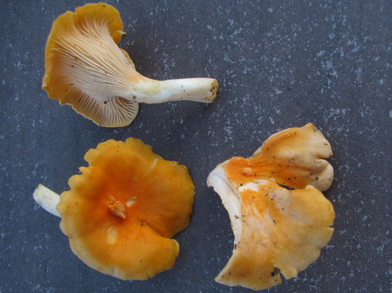 Außerdem konnte ich von 2 Stellen knapp 500 Gramm Pfifferlinge für das heutige Pfifferlings-Risotto einsammeln. 2 Tage zuvor auf einer 12 km-Strecke abseits der normalen Trampelpfade entdeckte ich einen Hang voll mit Samtigen Pfifferlingen (Cantharellus friesii), es waren Hunderte. Es wurden einige Exemplare für einen direkten Geschmacksvergleich mit normalen Pfifferlingen entnommen. Sie schmecken gut, das Aroma ist aber wesentlich flacher im Vergleich zum C. cibarius. Sie dürfen sich zukünftig von mir ungestört vermehren.